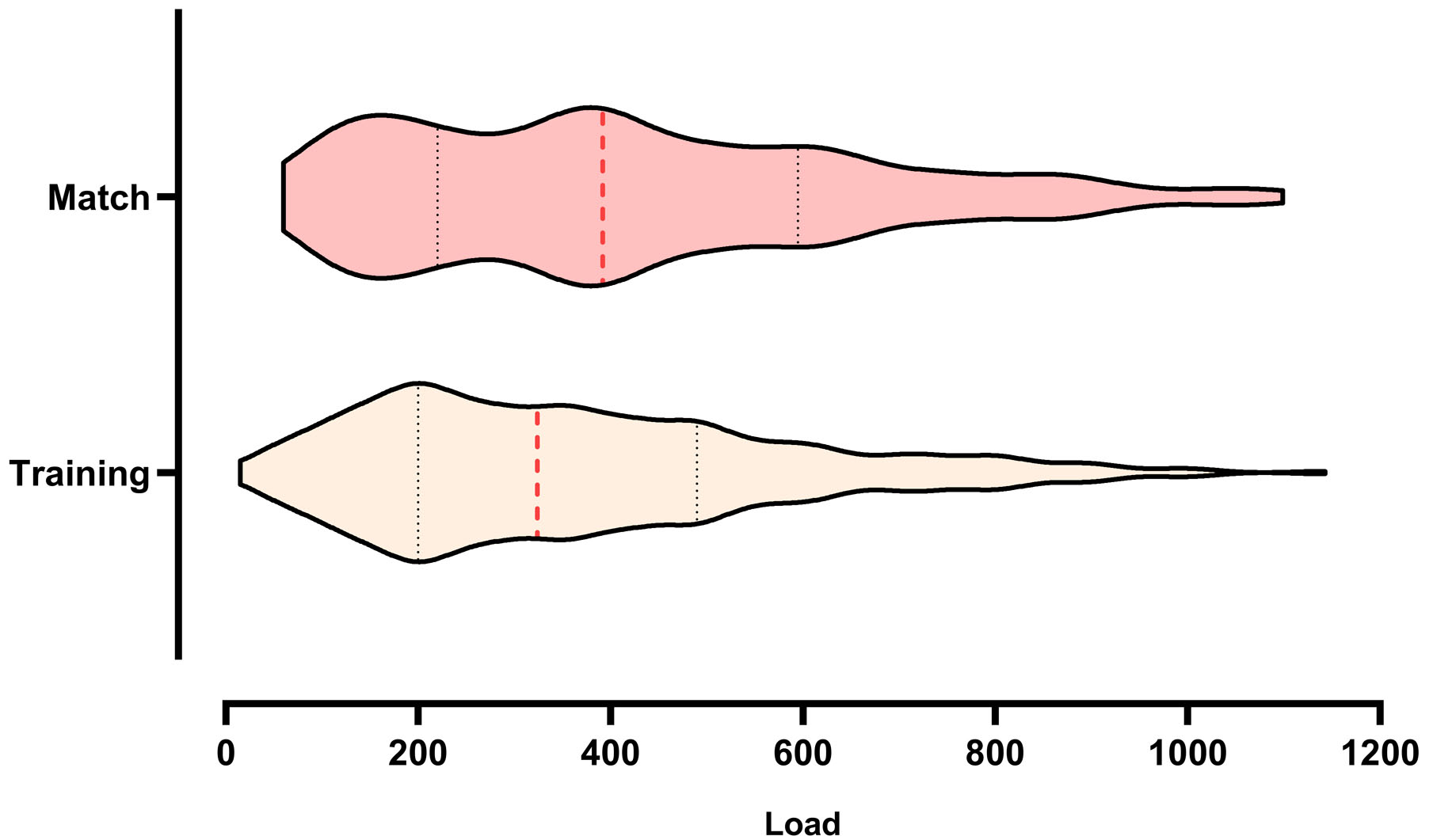 Distribution of internal training load during training sessions and matches. Each dot represents an individual session's load, calculated using the session-RPE method. Red bars indicate the mean and standard deviation for each condition. A wider dispersion and higher extreme values can be observed in match sessions, while training loads show a more concentrated distribution around moderate values.