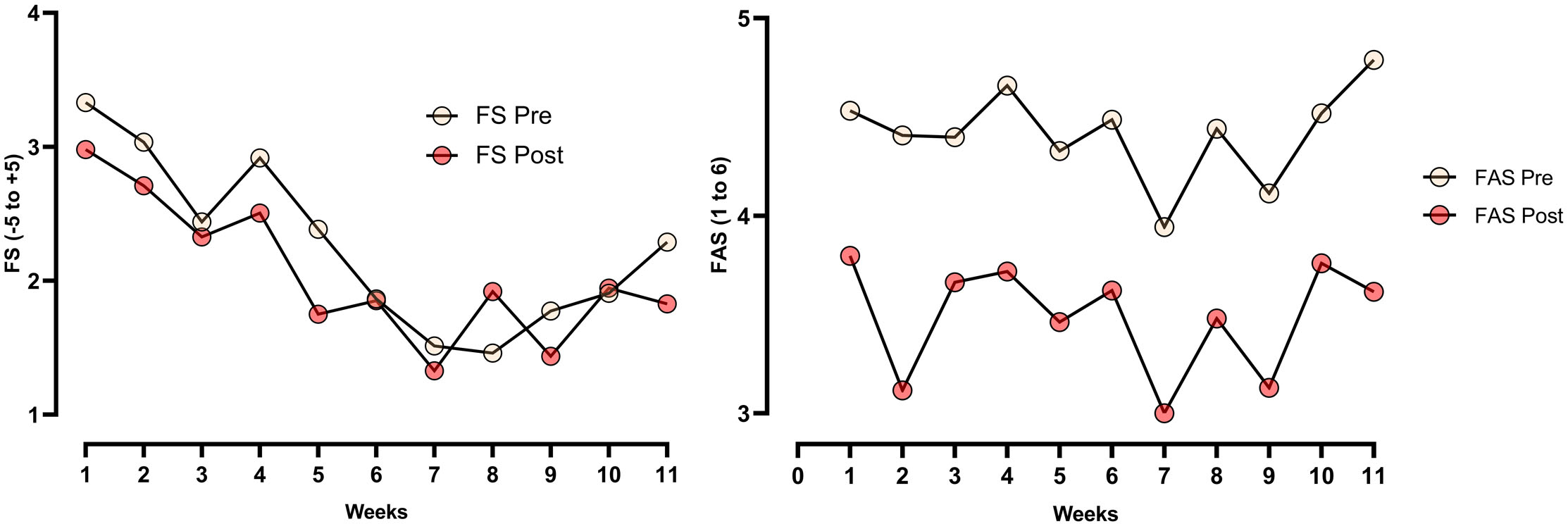 Weekly variation in affective responses measured by the FS (left panel) and the FAS (right panel) before and after training sessions and matches. Affective valence showed a progressive decrease across the weeks, with consistently lower values observed post-session. Arousal levels remained relatively stable pre-session, but they showed a consistent reduction post-session throughout the observation period.