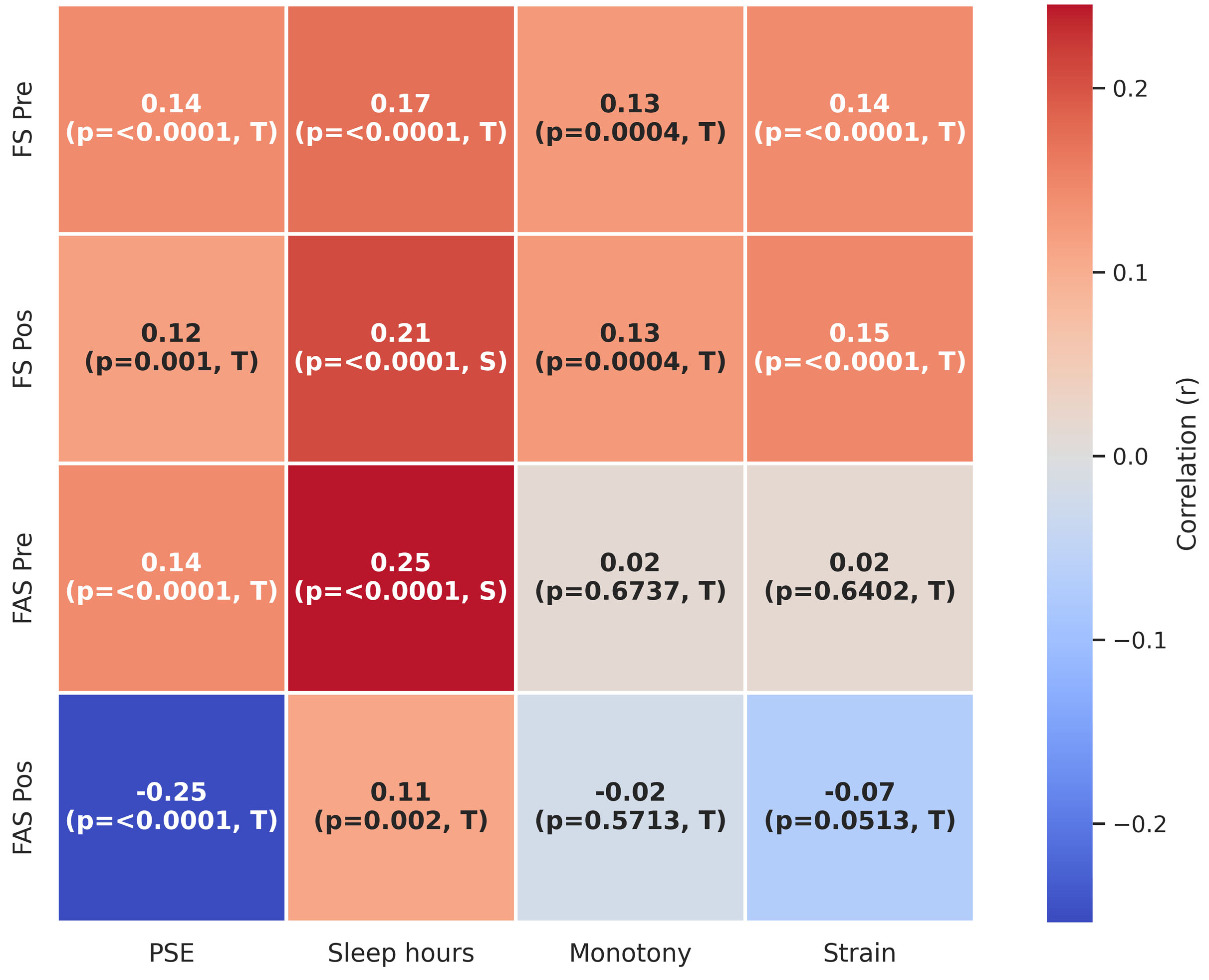 Heatmap showing the correlation coefficients (r) between affective responses, FS and FAS, measured before (Pre) and after (Pos) training sessions and matches, and traditional internal load variables: RPE, self-reported sleep duration, monotony, and strain. Each cell displays the correlation coefficient, significance level (p), and effect size classification, being trivial (T) or small (S).