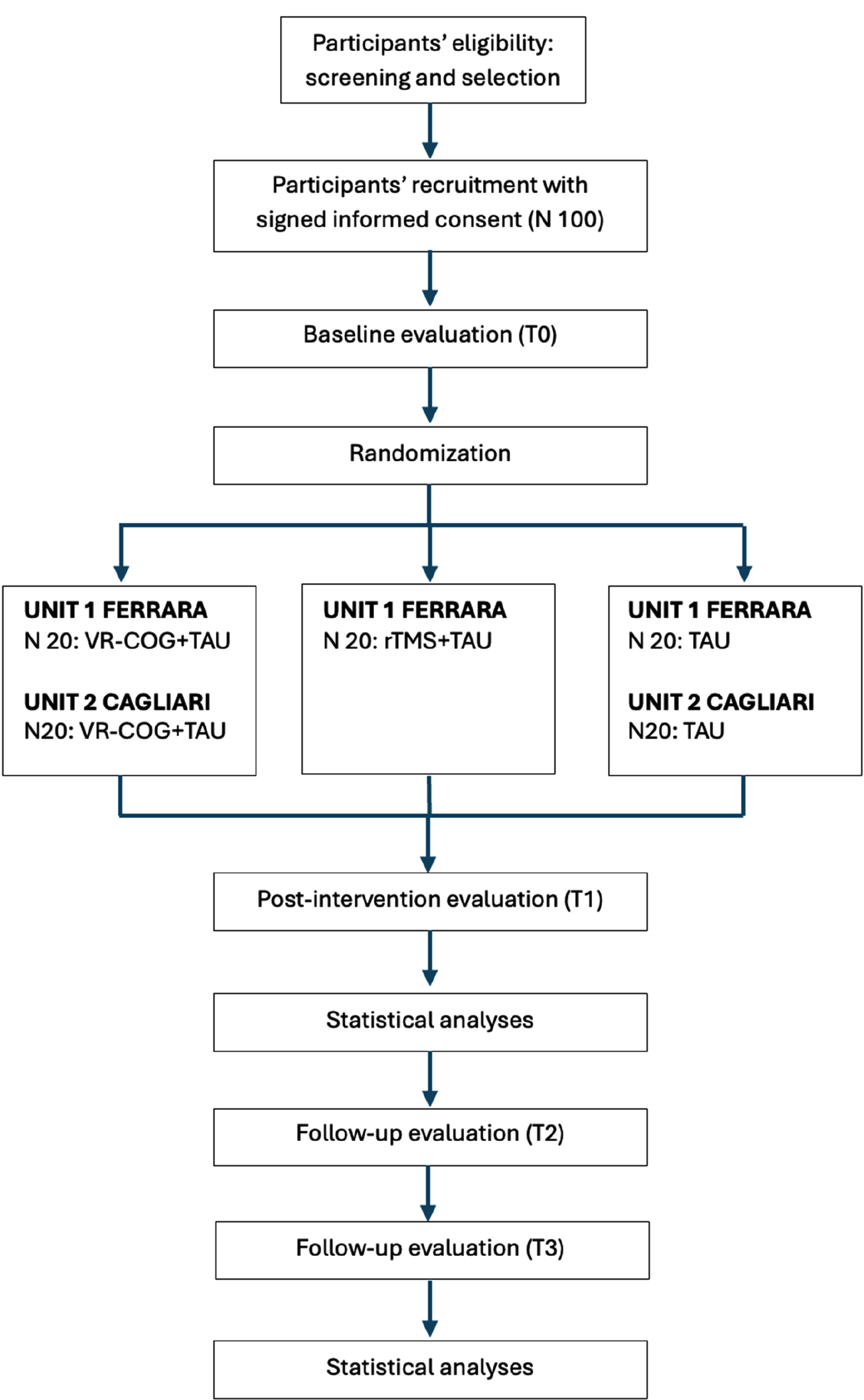 The tertiary outcome will be measured as cost-effectiveness [3] of the nonpharmacological treatments (VR-COG and rTMS), and it will be computed as the ratio of total costs divided by the mean improvements of quality of life across interventions (TAU, TAU+rTMS, TAU+VRCOG). Total costs will include the costs of the healthcare consultations (visits in the TAU condition), psychotropic drugs, equipment, and staff. Total costs will be computed as the sum of the costs of each intervention, divided by the number of patients. Quality of life improvements will be computed as the difference between the baseline (T0) and the endpoint (T3) quality of life. A summary of the timeline is provided in Fig. (1).