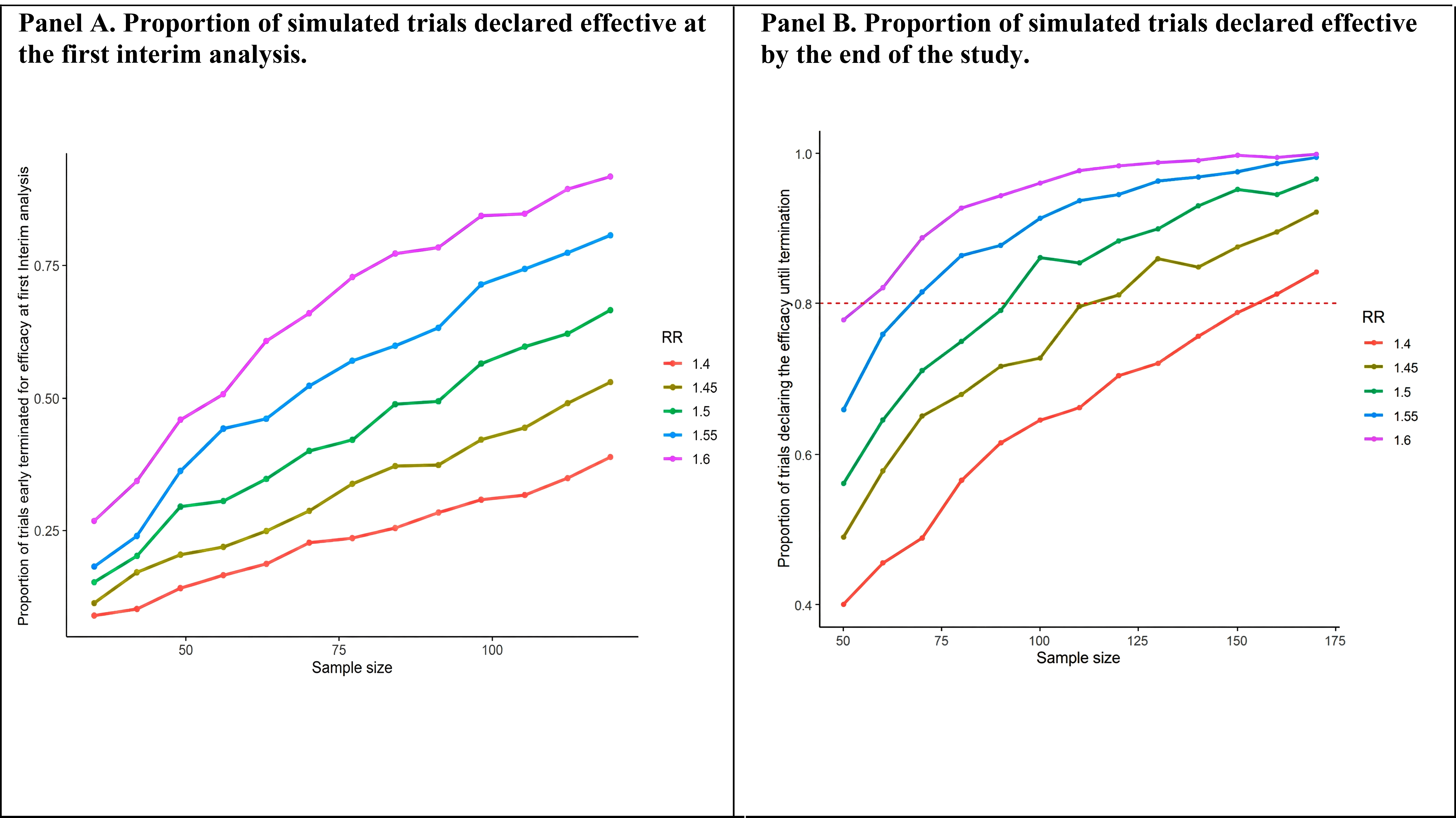 Literature convincingly supports the efficacy of TMS in major depressive disorder, although not specific to the oncological setting. A recent meta-analysis reported a significant effect on the remission endpoint of rTMS, with an odds ratio of 2.56 (95% CI: 1.73-3.78) [11], corresponding to a risk ratio of 1.5 (95% CI: 1.4-1.6). While no estimate is available on the efficacy of VR-based interventions comparable to VR-COG. Virtual reality-based interventions that do not include cognitive rehabilitation, within oncological settings, have shown effects with a standardized mean difference (SMD) in depressive symptom reduction of -1.11 (95% CI: -3.17 to 0.96) [15]. Considering that traditional (non-VR-based) cognitive rehabilitation for patients with depression, outside of oncology, is associated with a more modest reduction in depressive symptoms (SMD = 0.43; 95% CI: 0.17 to 0.70) [12], a conservative estimate of the effect size would be appropriate. Therefore, an SMD of 0.90, also corresponding to a risk ratio (RR) of 1.5, will be adopted. This design will be explored through a Monte Carlo simulation experiment with 10,000 runs. Each simulation run will assume a scenario with a different combination of effect size and sample size. For each scenario, the proportion of simulated trials correctly identifying at least one effective intervention will be computed, thereby estimating the empirical power of the study in a Bayesian context (Fig. 3). Specifically, in each run, trial data will be generated under various scenarios assuming a remission rate of 0.6 for the TAU group and a risk ratio (RR) for comparisons with the experimental groups ranging between 1.4 and 1.6 (Fig. 3). In the simulations, the total sample size n will vary from 50 to 170 patients, with increments of 10 subjects per simulation. The TAU and VR-COG groups will be assigned a sample size twice that of the rTMS group. For example, in a study with 50 participants, 10 patients would be assigned to the rTMS group (available only in Cagliari), 20 to the VR-COG group (Cagliari and Ferrara), and 20 to the TAU group (Cagliari and Ferrara).