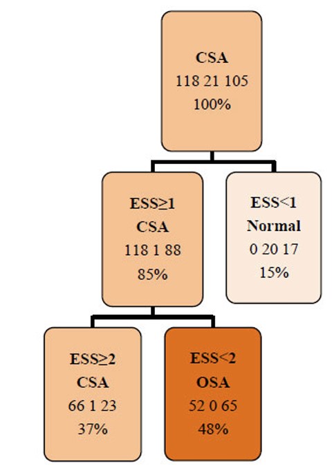Pruned Decision Tree. CSA: Central Sleep Apnea, ESS: Epworth Sleepiness Scale, OSA: Obstructive Sleep Apnea.