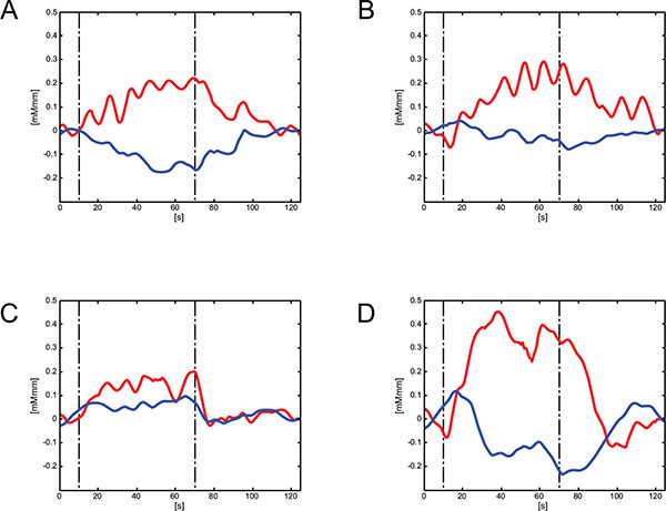 Grand average waveforms during the VFT task: Red line indicates grand averaged oxy-Hb data and blue line indicates grand averaged deoxy-Hb data. (A). Frontal hemodynamic change prior to the exercise therapy. (B). Frontal hemodynamic change after the exercise therapy. (C). Bilateral temporal hemodynamic change prior to the exercise therapy. (D). Bilateral temporal hemodynamic change after the exercise therapy. VFT: verbal fluency task.