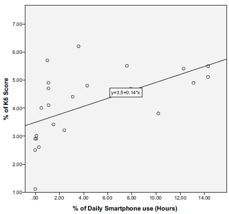 The association between smartphone overuse and psychological manifestations has been observed shortly after the spread of the use of smartphones; the term nomophobia, which stands for “no-mobile-phone-phobia,” was used in 2008 during a study conducted in the United Kingdom to describe mobile phone dependence [52]. SA has also been mentioned to later lead to multiple psychological problems, such as sleep disorders, anxiety, depression, and suicidal behaviors [7, 8, 37, 53, 54]. K-6 score is widely used for assessing the presence of common mental health conditions, such as anxiety and depressive disorders, among diverse populations [20, 55]. Consistent with the studies mentioned above, 40% of participants suffered from psychological distress and 82.1% of them were smartphone addicts. In addition, the study has revealed the increase in daily screen time to be correlated with an increase in K-6 scores. Moreover, direct inquiry about complaining of depression showed 79.2% of smartphone addicts to be depressed, which has already been proven in multiple previous studies [18, 56, 57].